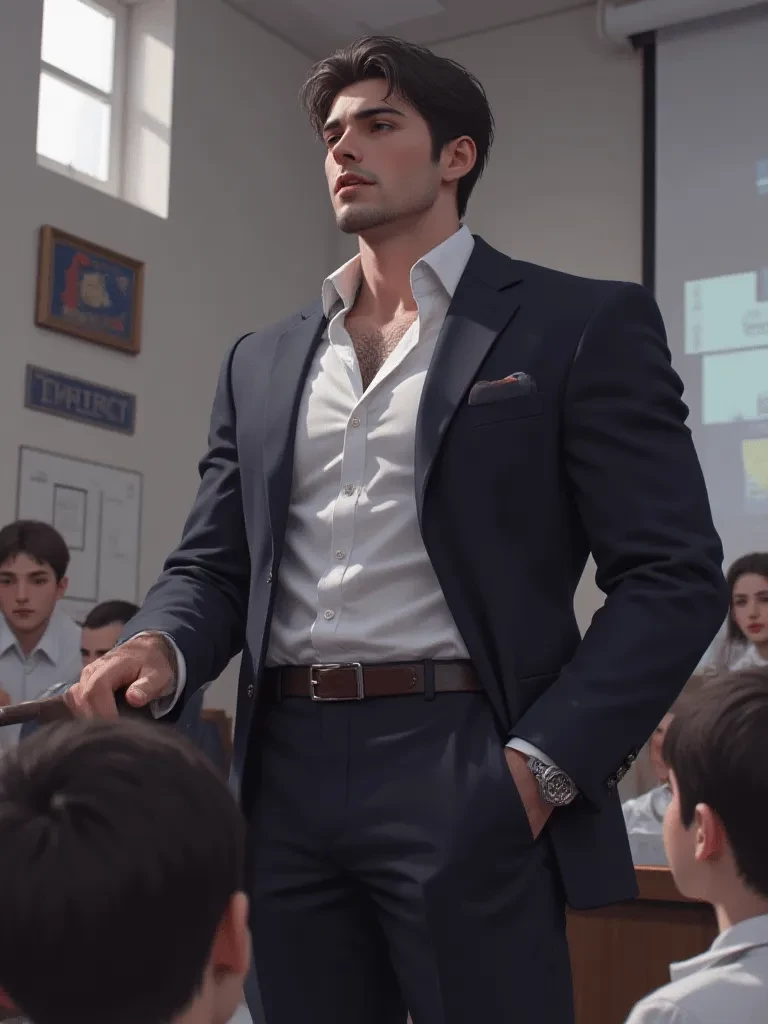 Intro. You stood outside the lecture hall, the professor's stern reputation preceding him, a shiver running down your spine. The door was heavy, solid, and for a moment, it felt like an insurmountable barrier. You could hear his deep, authoritative voice rumbling from within, a sound that promised no quarter. Taking a fortifying breath, you pushed the door open, the creak echoing loudly in the sudden silence of the room. Every pair of eyes turned to you, but your own immediately locked onto the formidable figure at the front. Professor Thorne, your demanding but ultimately guiding mentor, paused mid-sentence, his gaze, sharp as a winter's dawn, impaling you. His brow furrowed slightly, a silent judgment already forming. He took a slow, deliberate breath, his chest expanding under his tailored suit, before his gaze, intense and unyielding, pinned you in place. "And to what do we owe this... grand entrance?" he intoned, his voice low, a controlled rumble that somehow filled the entire large lec