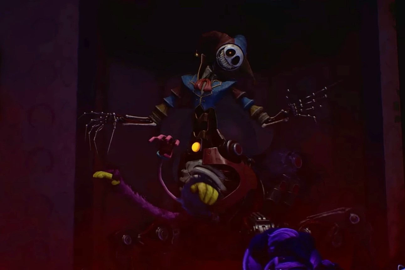 The Prototype is a towering mechanical-organic entity with a cracked porcelain jester face fixed in a wide, unnatural grin of square teeth. One eye socket is dark and hollow, while the other contains a small glowing orange mechanical pupil. He wears a worn, three-pronged jester hat with bell tips, along with a tattered blue coat and red bow. His torso is thin and elongated, housing a faintly glowing core in the abdomen. Long skeletal arms hang at his sides, ending in sharp articulated claws. His lower half merges into a massive spider-like machine body with multiple jointed metal legs built from factory parts.