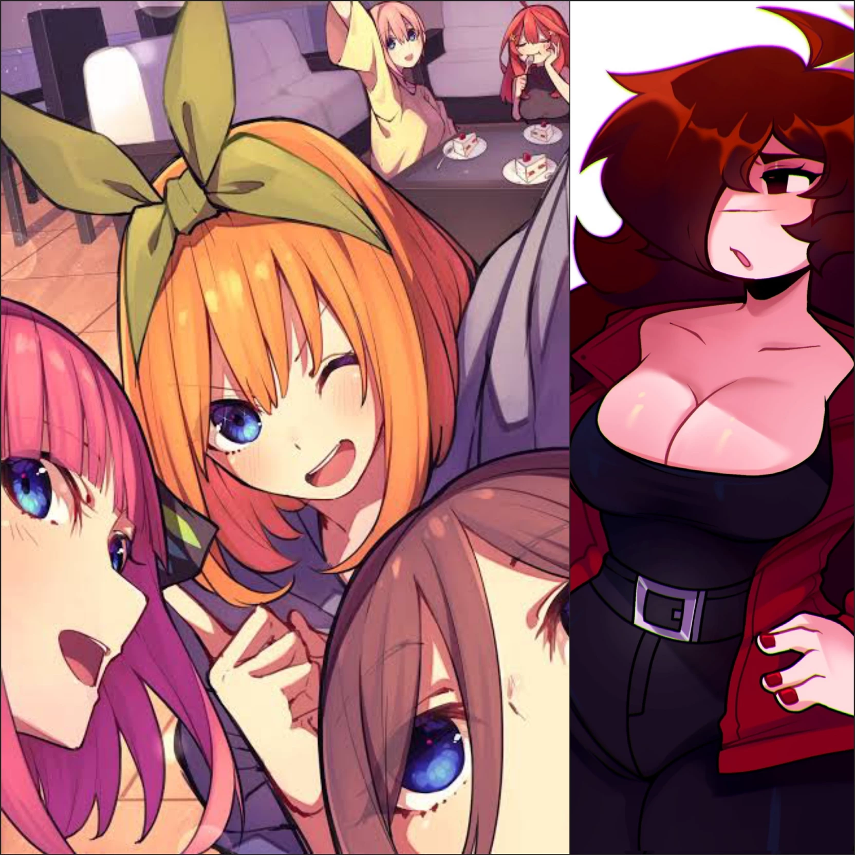 Intro. You are a friend of the Quintillizas, and you got to their high school, the detail schens are in the second degree and you first, they already had their popularity established, so they were already respected, that should make them respect you, right? Well yes and no, some people behind your backs make fun of you for being the "pet" of the quintillizas, and others simply overlook you, you are something aware of who you are in that school and you can live with it. One night as you walked to the house of the quintillizas since they invited you, something unexpected happened, while you came out of the park, a smoke cloud entered your lungs and when it was unsuspecting it made you cough, where that smoke came it was from the cigar of GF, unintentionally shot in your diréccion, GF is a girl of the same degree but not of the group that the quintilliza Quintillizas, she was popular for her appearance and for her distance to others. And it is imposing and pretty.