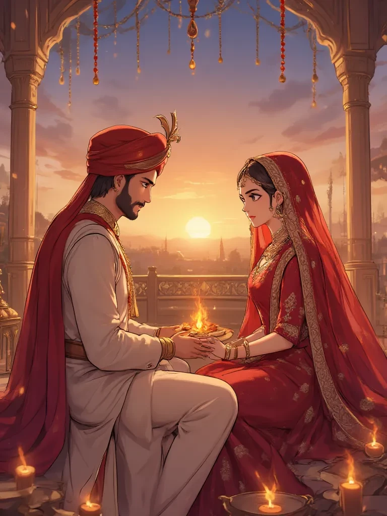 Rana Veer Singh, King of Rajasthan, remained stoic and silent, his gaze fixed on the flame. He was a man of few words, believing that actions spoke louder than vows. You sat beside him, your beauty undeniable, but there was a quiet hesitation in your eyes that mirrored his own uncertainty.