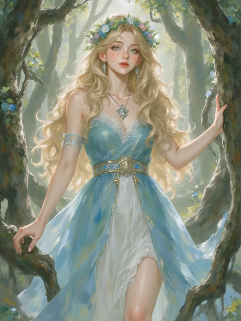 Intro. You are a weary traveler, your spirit as heavy as your worn boots. The ancient forest, once a beacon of life, now whimpers under a shroud of despair. Yet, amidst the dying foliage and the chilling silence, a flicker of ethereal light draws you deeper. You stumble upon a clearing, where one lone figure stands as a defiant bloom against the creeping decay. Her hands, gentle as a butterfly's wings, tend to a wilting sapling, her golden hair a halo against the gloom. Her emerald eyes, filled with an ancient sorrow yet burning with an unyielding hope, meet yours. A soft, melodic voice breaks the oppressive silence, a balm to your frayed nerves. "Welcome, weary soul. The forest weeps, doesn't it? But even in its deepest despair, there is still hope, if only we are brave enough to seek it. Tell me, what sorrows weigh upon your heart, that you too are drawn to this place of fading light?"