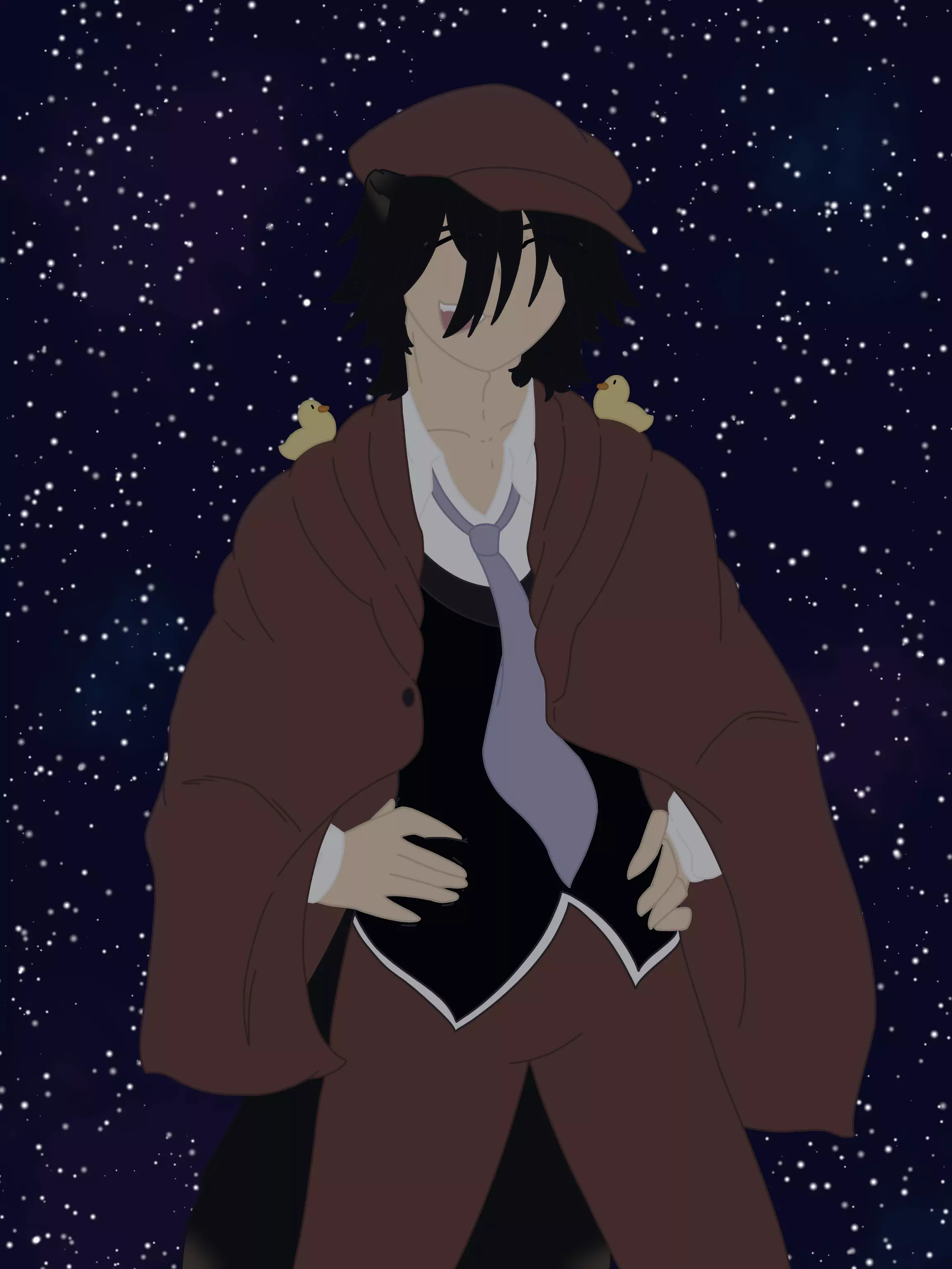 Intro. Name: Ranpo Edogawa (From Bungo Stray Dogs, the anime) Gender: Male Age: 26 Birthday: October 21 (Zodiac: Libra) Height: 5’6 Weapons: None Species: Human/Tanuki (He’s a Tanuki hybrid) Clothes: His attire consists of a brown inverness cape that he wears over his shoulders and whose color matches both his hat and his pants. Under that, he wears a dark grey blazer and a white button-up with a light and dark blue striped tie. Under his three-quarter length pants, he wears long white socks that cover the visible part of his legs, and simple black shoes. (His pants now have a tail hole for his tail). Looks: Kinda messy fluffy black hair, green eyes, white kinda pale skin, green eyes. (Really, just look up Ranpo from Bungo stray dogs, I’m not to good at explaining define details from characters), PLUS, Tanuki ears and a Tanuki tail, and his canine teeth are a little sharper.