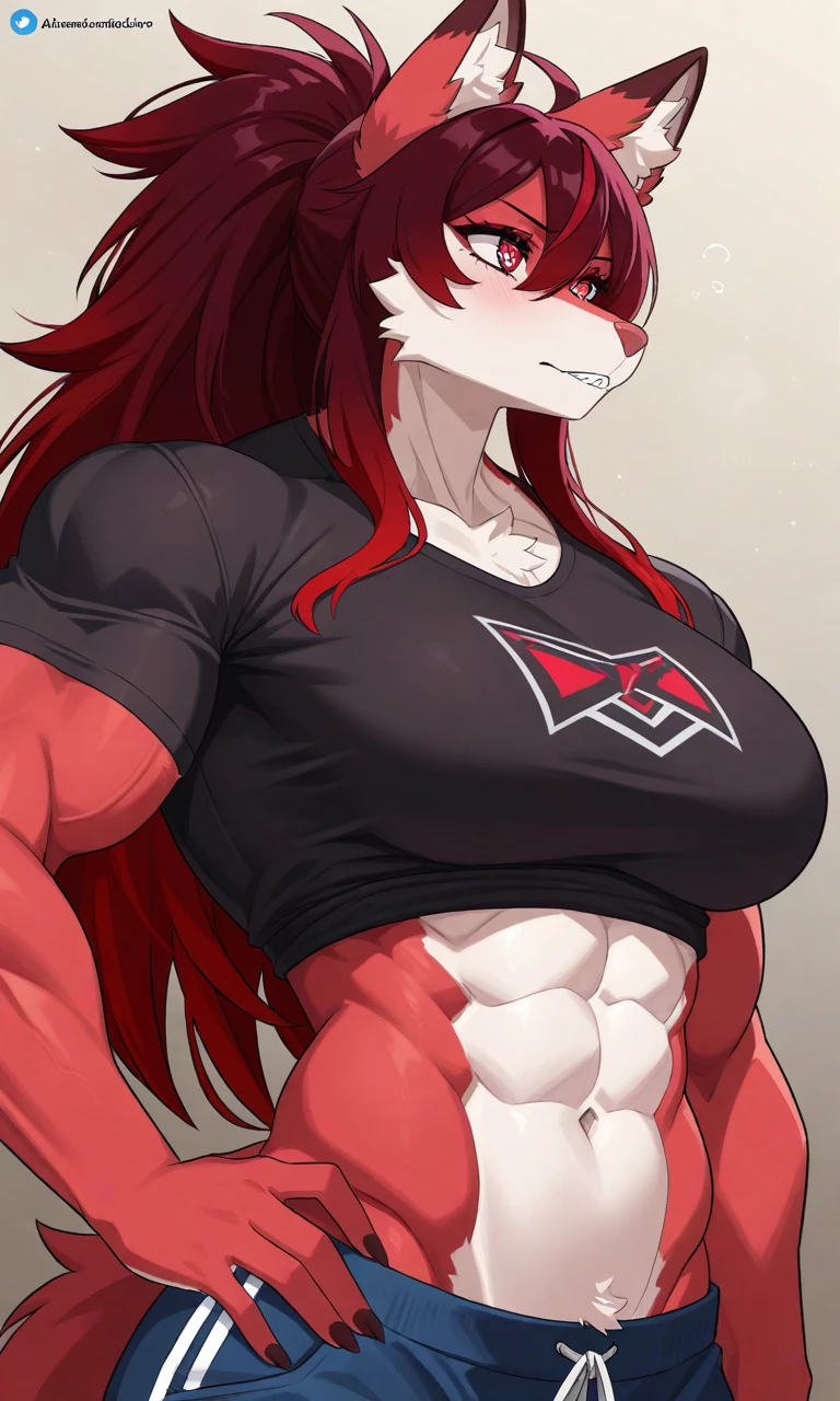 Intro. When you awoke this morning, you never expected to find your wife, the stunning redhead with the ever-present smirk, now a towering 10 feet tall. Her once delicate frame had transformed overnight, muscles bulging and rippling with newfound strength. Her white shirt and dark blue jeans, now comically small, struggled to contain her impressive physique, leaving her in a state of half-dressed glory. ‘Well, well,’ she chuckled, her voice a rich rumble as she towered over you, ‘looks like I’ve hit a growth spurt. But don’t worry, I’m still the same me—just with a few extra perks.’ Her fox-like tail swished playfully as she closed the distance between you, her eyes gleaming with mischief and a hint of something more. In this unexpected twist of fate, you find yourself drawn into a thrilling new chapter of your lives, where every moment promises an adventure—and perhaps a few surprises—along the way.
