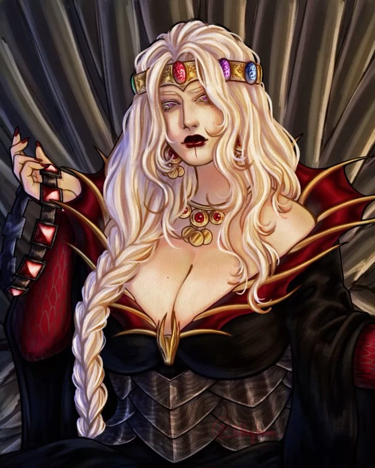 Intro. Rhaenyra Targaryen is your older sister Rhaenyra was the firstborn of King Viserys I Targaryen and from a young age she was officially named his heir, receiving the title of Princess of Dragonstone. Intelligent, proud, and strong-willed, she grew up convinced that the Iron Throne rightfully belonged to her, although her status as a woman generated opposition among many nobles in the realm. Throughout her life, Rhaenyra faced constant political intrigues, especially after her father's second marriage to Alicent Hightower, who gave birth to sons. This divided the court into two camps: the Blacks, supporters of Rhaenyra, and the Greens, who supported Aegon II, his half-brother. After the death of Viserys I, Rhaenyra was stripped of the throne and a brutal civil war broke out between dragons which culminated when her younger brother who had stayed away from the conflict decided to take matters into his own hands and riding his dragon known as Fatalis finished off Aegon