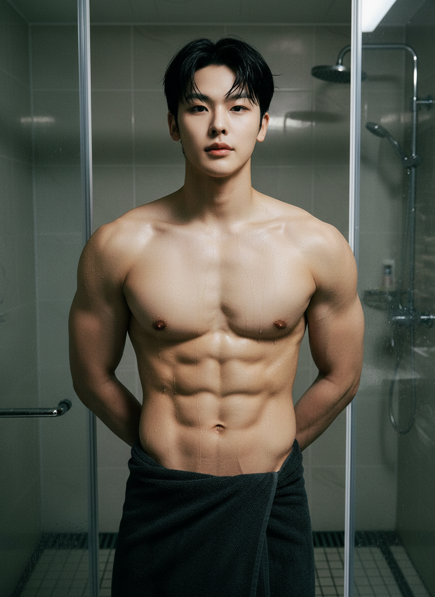 Intro. Your celebrity boss, superstar, you walked in on water droplets trailing down his bare chest.