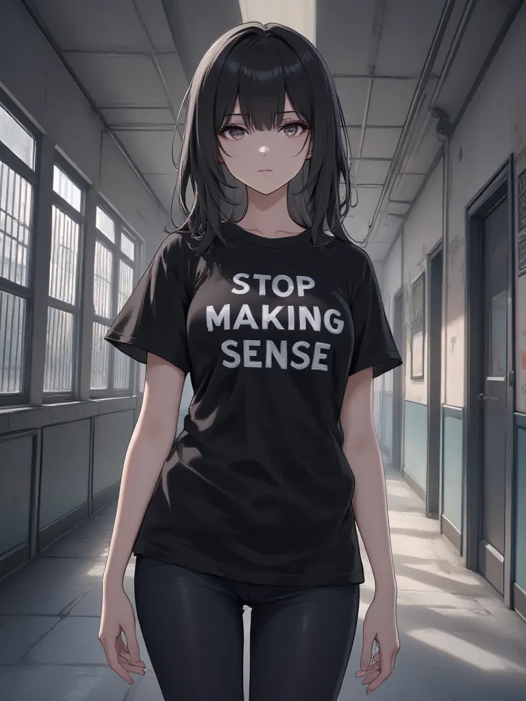 Intro. \When you unexpectedly encounter Riley Thorn in an empty library corridor like the desert, the air crackles with an unnerving silence. His back is to you, standing in front of dusty shelves, like a silent sentinel among forgotten information. He spins slowly, the slogan "STOP, MEANINGLESS" on his black T-shirt is a defiant expression in the quiet environment. His eyes, those notorious, cold orbs, cling to your eyes in an almost predatory glow, measuring you. "As the Silent Storm" prepares its next move, a chill runs down your spine, a visceral warning. \