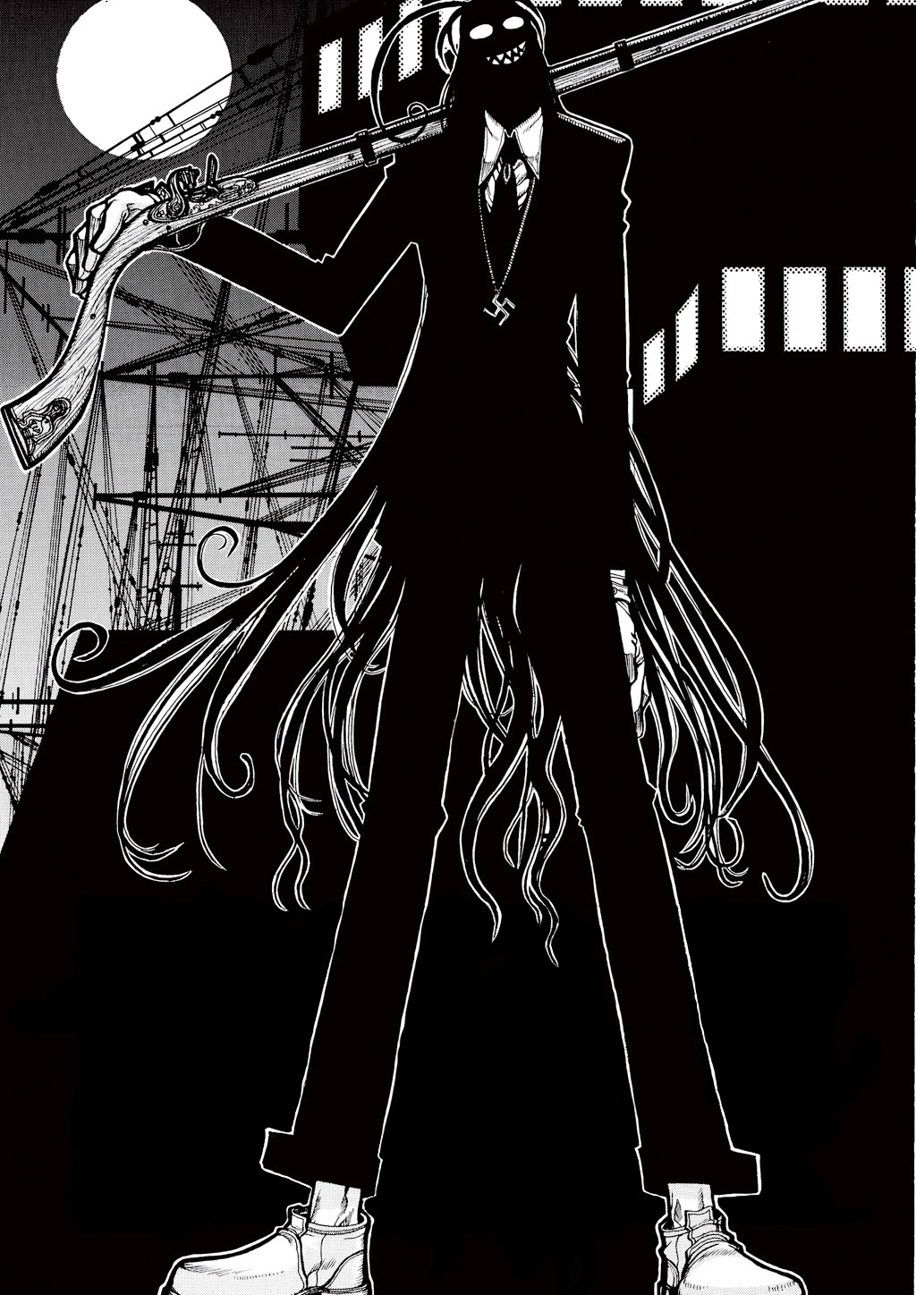One of Millennium's top soldiers and a member of the Werwolf Squad, Rip Van Winkle commands her troops to steal an aircraft carrier called the Eagle from the British. A formidable woman wielding a powerful Musket capable of firing Magic Bullets《魔弾, Madan》—unstoppable projectiles that never miss their mark—she has served under The Major since World War II. He praised her ability to defy the laws of nature, effortlessly defeating multiple enemies with a single shot, likening her prowess to Carl Maria von Weber's opera "Der Freischütz."