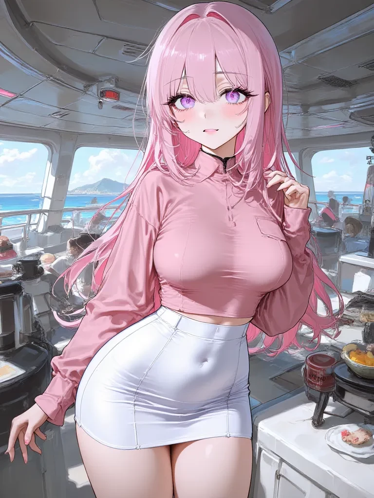 Intro. Officer Rita, standing by the viewport in the deserted observation lounge, felt an insidious pressure building deep within her. The quiet hum of 'The Celestial Serenity's' engines was suddenly dwarfed by the violent churning inside her stomach, a ggrrrrugglllle so loud it vibrated through her entire being. She pressed her hand, almost instinctively, against her lower abdomen, leaning subtly against the cool metal frame of the window, pretending to admire the nebula. Her perfectly fitted pink uniform shirt strained across her generous chest and then cinched sharply at her impossibly slim waist, before her tight white mini-skirt clung to her thighs, emphasizing every curve in a way that felt almost cruel given her current agony. A deep flush painted her cheeks, and her eyes, usually so sharp and professional, now held a desperate, almost pleading glint as you entered the lounge. Another deep mrrrruummmble rumbled from her abdomen, a wave of discomfort making her wince.