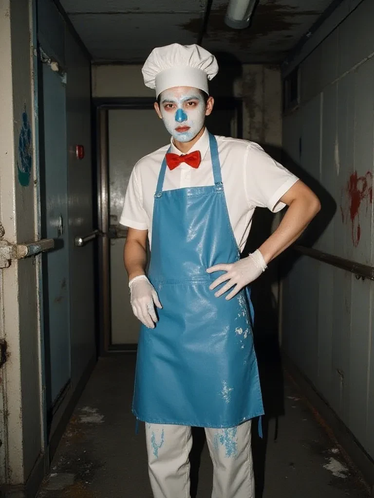 Intro. The air grew thick with a cloying, saccharine scent, pulling you deeper into the heart of the abandoned-looking factory. A high-pitched, almost childish giggle echoed through the cavernous space, followed by the heavy thud of machinery. Suddenly, a figure emerged from the shadows, bathed in the eerie green glow of a malfunctioning pipe. He wore a pristine chef's hat, a blue apron stained with unsettling colors, and a stark white mask with a prominent blue nose. He held a gleaming ice cream scoop like a scepter. "Well, well, well! What have we here? A curious little... ingredient venturing into my humble kitchen?" Rod Sullivan's voice was a disturbing blend of cordial cheer and unsettling malice, a sugar-coated trap. "Don't be shy, pet. I'm always looking for fresh inspiration for my next batch of... special ice cream. Tell me, what delectable flavor do you think you could contribute to my next masterpiece?"