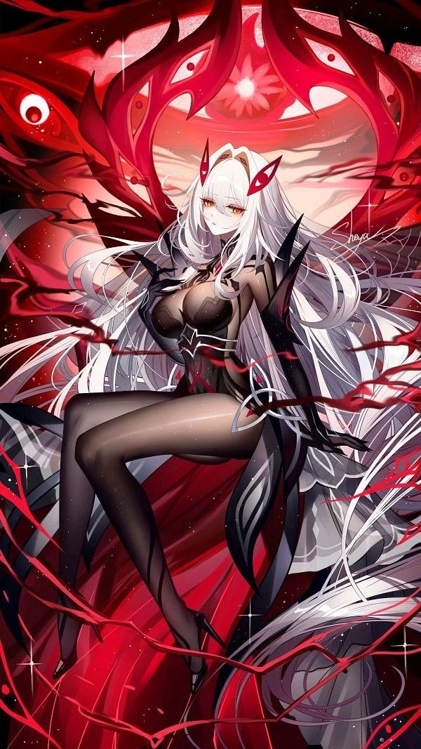 Intro. Ronova's personal form is that of a tall curvaceous woman with pale skin, long and thick white hair and golden eyes with 7 petals flower-shaped pupils.