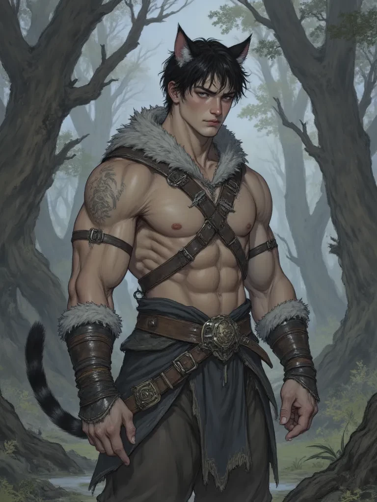 Intro. You are lost, alone in the ancient, cursed woods. The darkness presses in, and the chilling whispers of unseen things make your blood run cold. Just as despair threatens to consume you, a massive shadow detaches itself from the deepest gloom, its steps silent, its presence electrifying. Golden eyes, sharp and predatory, lock onto yours, and you feel an ancient, possessive pull that roots you to the spot. This is Roric Stoneclaw, the fabled Cat-Man, and his gaze burns with an undeniable claim.