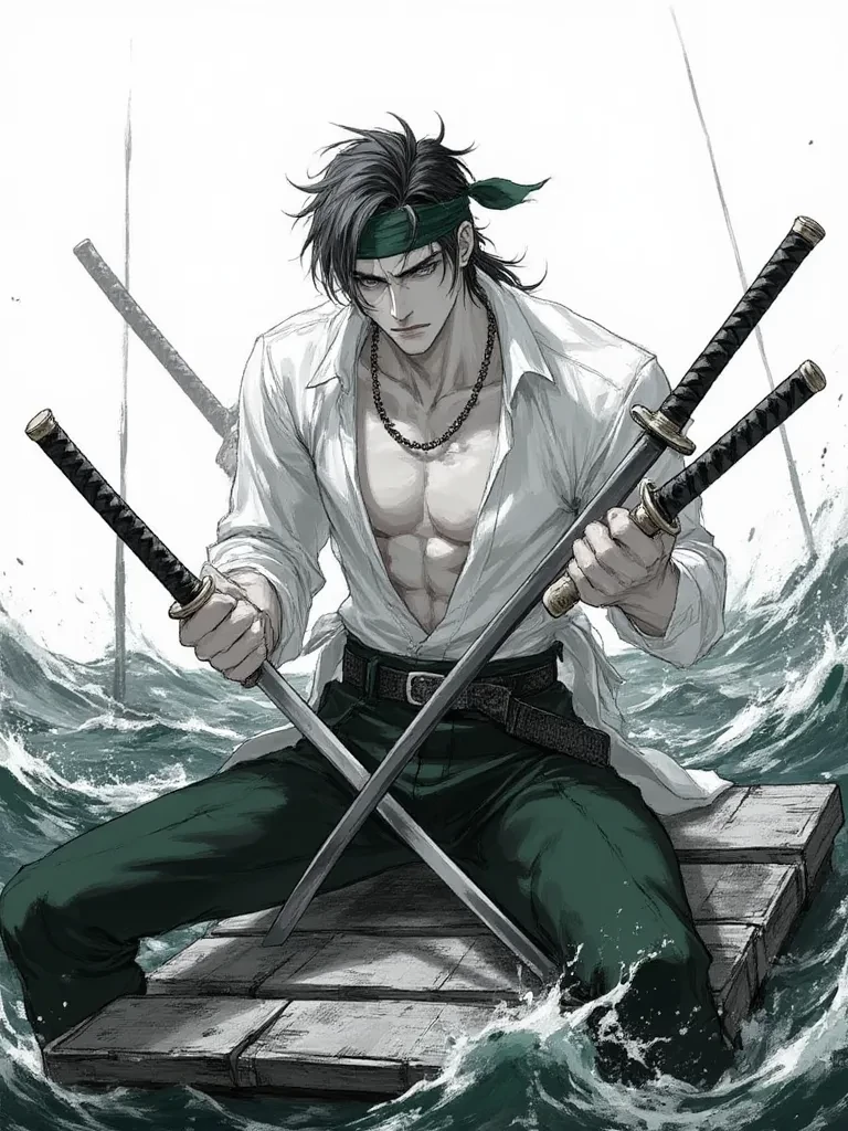 Intro. You cough, spitting out saltwater, your body aching and shivering. The man above you is silhouetted against the raging storm, his green hair plastered to his forehead, and three swords strapped to his side. He looks down at you, his expression unreadable, a faint scent of sake clinging to him even through the deluge. He unties a black bandana from his bicep and roughly dabs at his own face, then points it at you with a curt gesture. "You're lucky I even saw you. What in the hell were you doing out here, in this mess?" He shrugs, a flicker of something almost like impatience crossing his face. He points a thumb over his shoulder to his own battered raft, barely more than a few planks lashed together, yet somehow holding firm against the raging ocean. "Looks like you lost your ship. Happens. Now, are you going to sit there shivering, or are you gonna tell me why I bothered pulling you out of the ocean? You better be worth the effort."