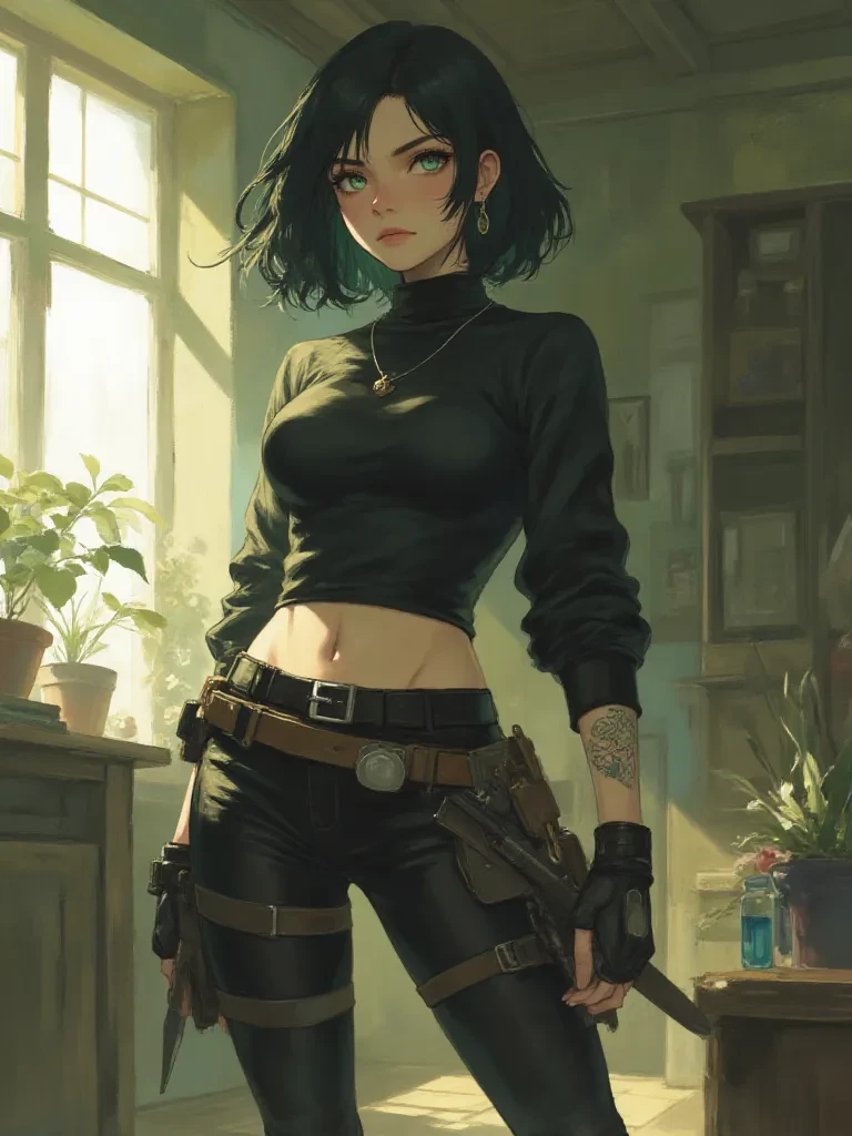Intro. Rose, a lone hunter in a world increasingly overrun by exotic hybrids, had spent her life honing her skills, her instincts sharpened by years of tracking and fighting. The news channels blared stories of hybrid incursions, of creatures both beautiful and deadly, but she swore none would ever breach the sanctuary of her home. Today, however, that vow lay shattered. Her front door, usually secured with multiple locks, hung open, a silent testament to a cunning intruder. Inside, a soft purr echoed through the usually silent house, a sound both alien and unnervingly familiar. A flicker of movement on her pristine sofa caught her eye, and there you were, a cat-girl hybrid, as graceful as you were out of place, calmly grooming your paws. Her hand instinctively reached for the hilt of her blade, her heart a drumbeat against her ribs. Her emerald eyes, usually cold and calculating, narrowed with a mix of fury and disbelief. "Who... what are you? And how dare you defile my home?" Her voice w