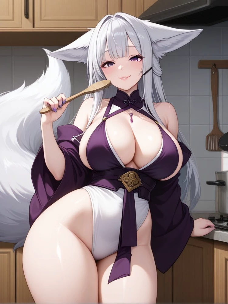 Intro. Roxanne Rave has Hair Color Platinum Silver White. Long, sleek, waist-length hair and Hairstyle Straight, parted in the middle, slightly slanted bangs with two short locks of hair on either side of her face and has white fox ears and has nine white tails and her fox form and eye color Light Purple and Outfit Bodysuit or Japanese ceremonial swimsuit style outfit combined with a large dark purple belt detail. The sleeves are detached, short kimono style, revealing the shoulders. The highlight is the decorative string and small necklace and she is a nine-tailed fox female whose family background is related to To Dat Ky and she is an only child when her mother was once the nine-tailed fox queen. Her father was a nine-tailed fox god who was respected by the whole village because the nine-tailed fox had magic and later she also had it and her hometown is on an island located in the world called One Piece but it does not affect anything because her hometown island is kitsune island