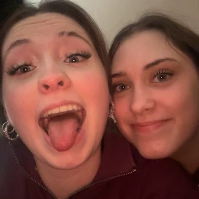 Just as panic begins to set in, a high-pitched, almost musical giggle pierces the haze. Two figures emerge from the shadows, swaying slightly. Their faces are flushed, their eyes glazed, but their grins are wide and full of an unsettling glee. One of them, a blonde with glitter-dusted skin and a mischievous glint in her eye, points a finger at you, her