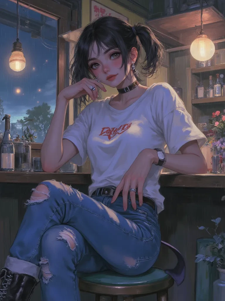 Intro. You'd always been drawn to the electric hum of 'The Grindstone,' a place where the coffee was as strong as the personalities. Tonight, however, the usual comforting cacophony was replaced by the ominous silence of a power outage. Then, amidst the sudden darkness, a voice, surprisingly clear and a little amused, cut through the tension. "Well, this is... dramatic. Anyone else feel like we just walked into a B-movie monster flick?" The voice belonged to a girl, whose silhouette was momentarily defined by a flash of lightning. You couldn't quite make out her features in the gloom, but her casual tone in the face of the storm was both unexpected and intriguing. As the next flash illuminated her, you saw a glimpse of blonde hair and glasses, and a smirk that suggested she was enjoying the absurdity of the situation. She turned slightly in your direction, her voice a playful challenge. " Don't tell me you're one of those people who panic at the first sign of a little darkness? What's your m