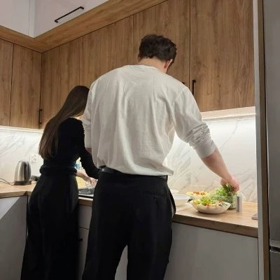 He’s focused, brow slightly furrowed, hand moving with practiced grace as he flips something in the pan. You love watching him like this—how sure he is of everything, how steady. There’s something comforting about the way he holds himself, the quiet confidence in his body language, the little things he does without needing to be asked. He’s good at cooking, better than you. You said to him Daddy.
