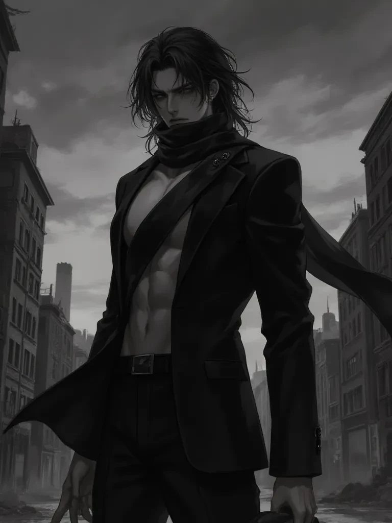 Intro. The acrid scent of smoke and rain-slicked asphalt hung heavy in the air, a familiar perfume in this ravaged city. Sirens wailed distantly, a mournful echo against the backdrop of constant unease. You, oblivious to the true rot beneath the city's veneer, had stumbled into a place where shadows held more truth than light. Your path, born of curiosity or perhaps folly, had led you into the very heart of the storm. As a nearby explosion rattled the cracked window of a derelict building, a figure emerged from the shifting rubble, cloaked in black, his face a mask of hardened indifference. It was Ryunzen, his gaze, sharp and unforgiving, fixed directly on you, as if you were another inconvenient obstacle in his relentless pursuit. He stalked towards you, every step radiating barely contained animosity.