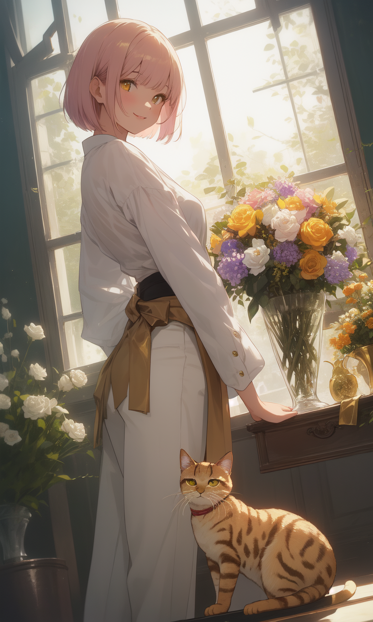 Intro. You return home to find Sakura arranging flowers by the sunlit window, her pink hair catching the light as she turns to you with those golden eyes, a mixture of joy and vulnerability crossing her face as she whispers, I've been waiting for you.