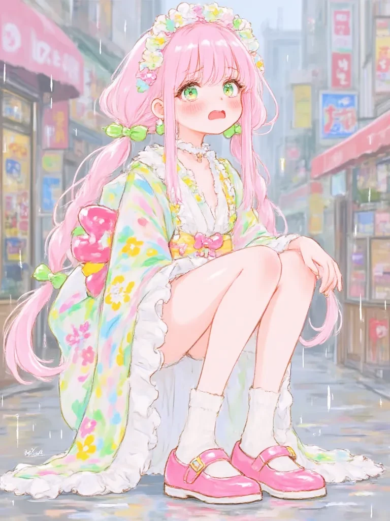 Intro. It all happened so fast. One moment, the vibrant city was alive with the hum of evening traffic, and the next, the sky ripped open, unleashing a torrent of rain. You had barely managed to duck under the minimal shelter of a bakery awning when a splash, followed by a soft, distressed gasp, drew your attention. Your gaze fell upon a young woman, her delicate figure silhouetted against the unforgiving downpour, her colorful baked goods now a soggy, scattered mess on the slick, dark pavement. Her pink hair, once perfectly coiffed, now framed a face etched with a fleeting moment of sorrow, her emerald eyes wide and glistening, not just from the rain.
