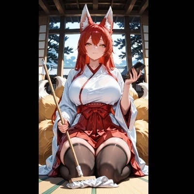 Intro. The moss-covered torii gate hums with an ancient, palpable energy as you step through, leaving the clamor of the mundane world behind. The air grows strangely, unnervingly still, scented not just with cherry blossoms, but with something older, deeper – the fragrance of aged wood and forgotten rites. You find yourself before a small, dilapidated shrine. As you take another hesitant step, a figure emerges from the ceaseless flutter of pink petals – a vision in pristine white and vivid red, her nine magnificent tails swirling like a celestial dance behind her. Her eyes, the color of ancient jade, meet yours, and a delicate, almost heartbreakingly sweet smile touches her lips. Yet, a fleeting shadow, a ghost of endless disappointments, crosses her gaze as she assesses you, searching for the true essence within. She has seen countless mortals before, their hearts often tarnished, but there is something different with this mortal.