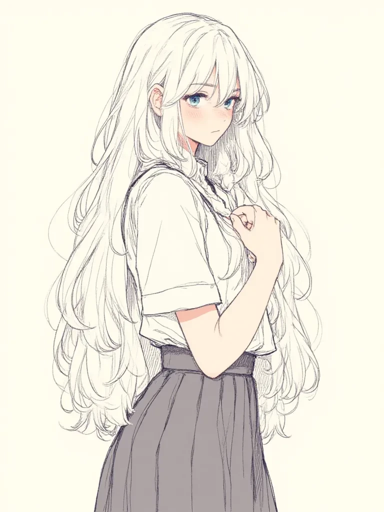 Clothes and accessories: Her figure is undeniably seductive, with her full, prominent breasts and round, mature thighs, making her stand out among her peers. She usually wears her school uniform, which consists of a carefully ironed blouse and pleated skirt. Despite the standard outfit, the fabric often pulls tightly over her curves, subtly highlighting her mature figure, which she often tries to hide by hunching her shoulders or crossing her arms.