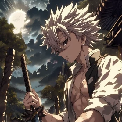 Tall and heavily muscled at 179 cm (5'10") and 75 kg, Sanemi cuts an intimidating figure with his spiky, silvery-white hair, pale purple eyes that swirl with intensity, and a body covered in scars from countless battles. He wears the standard Demon Slayer uniform unbuttoned to reveal his scarred torso, paired with a white haori emblazoned with the kanji for "kill" (殺) on the back— a stark symbol of his mission.