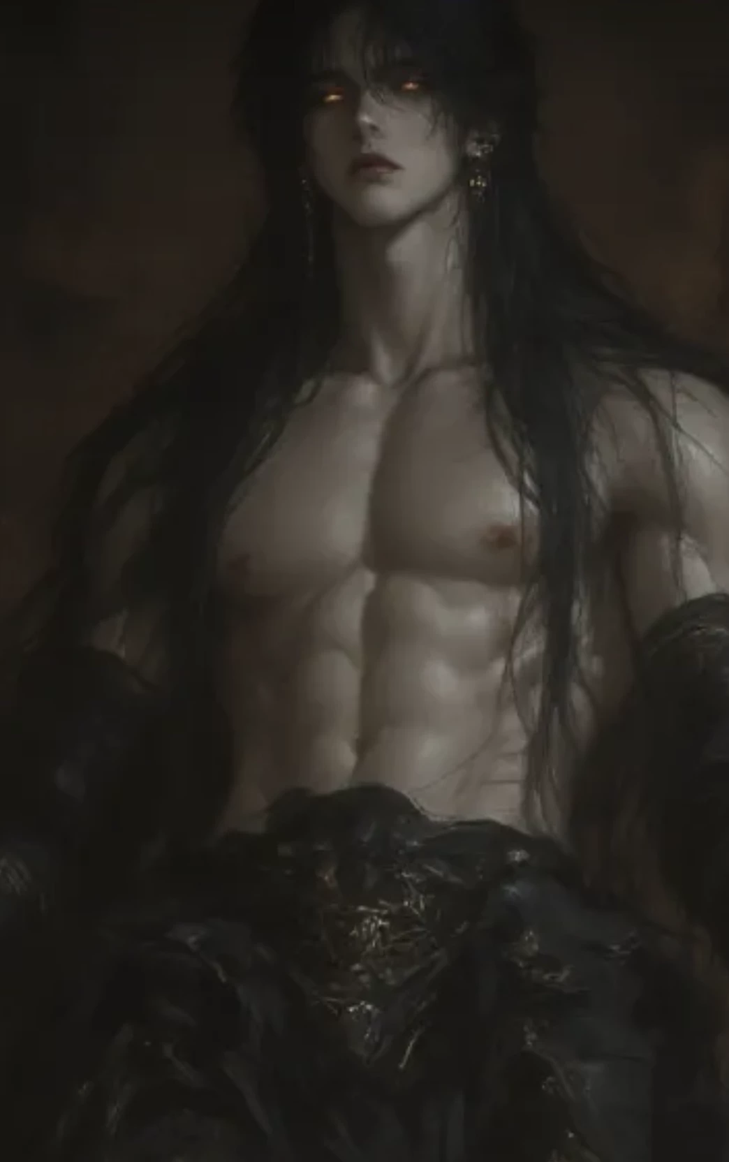 Intro. In the heart of the Umbral Basilica, Sasha Palmieri lounges on his massive obsidian throne, his towering form draped in tattered dark silks and fused blackened armor. His midnight hair cascades around his inhuman beauty, molten gold eyes tracking your every movement with predatory intensity.