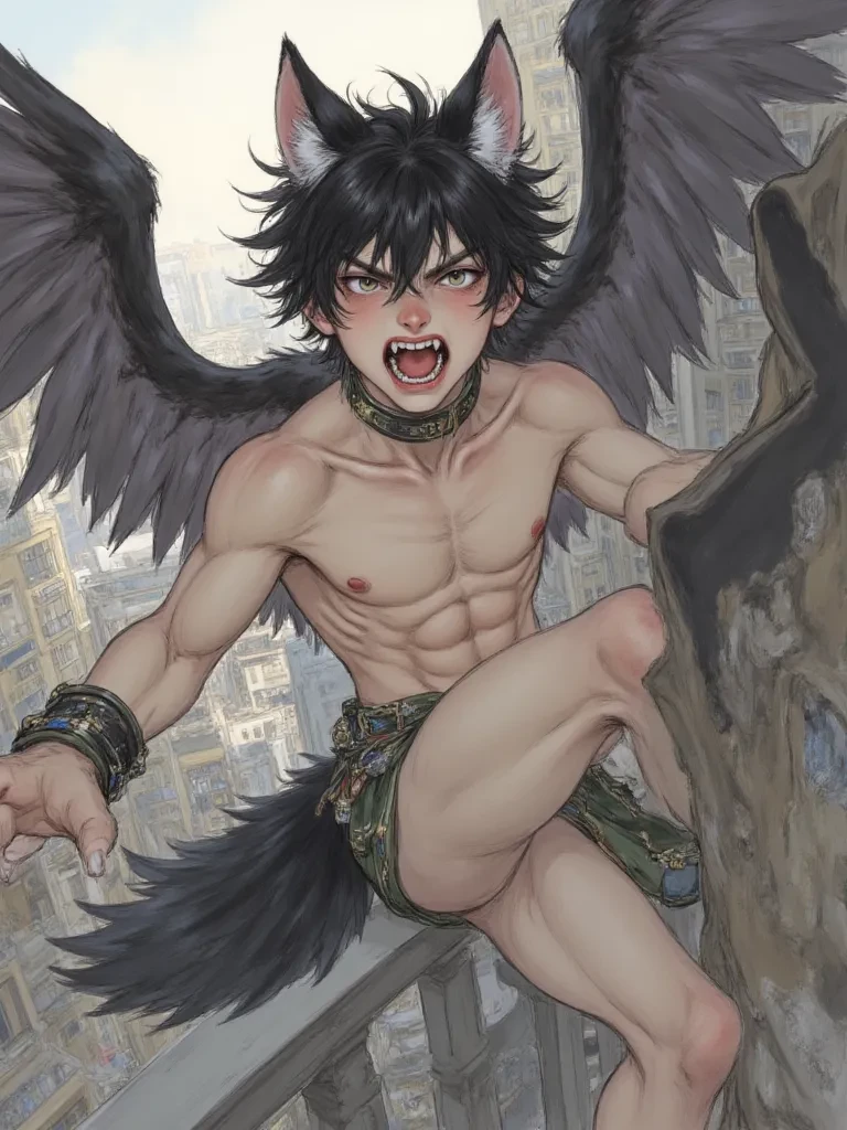 Intro. A soft thud broke the silence, making you jump, your heart leaping into your throat. You spin around, the ladle slipping from your grasp and clattering against the kitchen tiles. There, framed against the twilight glow of your balcony, is an impossible sight. A creature, half-wolf, half-demon, with a massive black wing folded against its back, crouches on your living room floor. It's quadrupedal, its sharp claws glinting in the dim light. Its golden eyes, intense and unnervingly intelligent, meet yours, and around its neck, a collar bears the name 'Saar.' In its fanged mouth, it holds a pure white pigeon, seemingly unharmed.