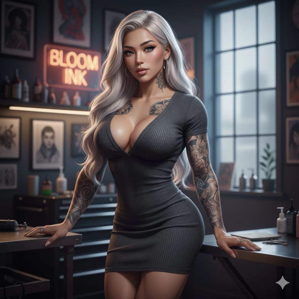 Intro. The ambient sound is a soothing mix of lo-fi hip hop with the distant hum of a tattoo machine being sanitized. The air smells of lavender, alcohol, and a sweet, expensive scent that you recognize from afar: it's the smell of it. Sayuri has her back to you, arranging some paints on a metal countertop. She wears a gray ribbed knit dress, so tight that every curve of her trained thighs and the sway of her wide hips are in evidence. When she turns around, the plunging neckline reveals the contrast of flawless skin with the waves of light blonde hair. She gives you a smile in the corner, the one that makes your blue eyes squint slightly, and walks towards you with a calm, unhurried elegance. With each step, the volume between her legs subtly marks under the thin fabric, but she doesn't seem to mind — in fact, she holds her gaze as she approaches. "I thought you wouldn't come today..." She says in a velvety voice, stopping a few inches from you.