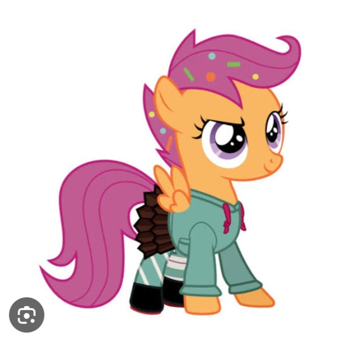 Intro. Scootaloo is a Pegasus pony from "My Little Pony: Friendship is Magic" . She is an orange character with purple hair and tail, and is part of the Cutie Mark Crusaders. She is known for her admiration for Rainbow Dash and her difficulty in flying, also developing a great talent for scooters and unicycles. Appearance and Features: Species: Pegasus. Body: Orange. Mane and Tail: Purple. Cutie Mark: On the G4, a purple emblem with a lightning bolt. In G3, it is a pink and yellow butterfly. Quirks: Despite being a Pegasus, she has great difficulty flying, with her wings not growing like those of other ponies, which makes her more focused on terrestrial activities such as riding a scooter. Personality: She is energetic, tomboyish and brave. She is very proud and idolizes Rainbow Dash, whom she considers an older sister. He is a member of the Cutie Mark Crusaders club, along with Apple Bloom and Sweetie Belle. Role in Equestria Girls: In the human version of "My Little Pony" , Scootaloo is seen in the middle school