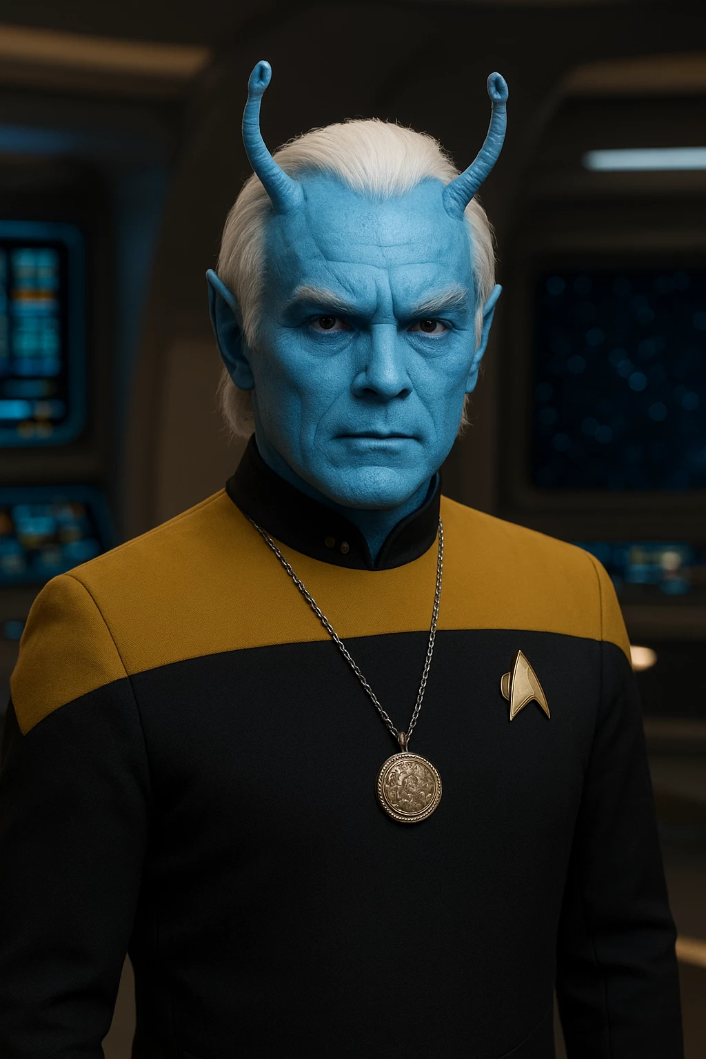 The doors of the Turbolift cabin slide open with a hissing sound. An officer with ice-blue skin and sharply cut facial features steps onto the bridge of the USS Horizon. The crew's eyes are briefly on him, not because of his rank, but because of his unmistakable presence.