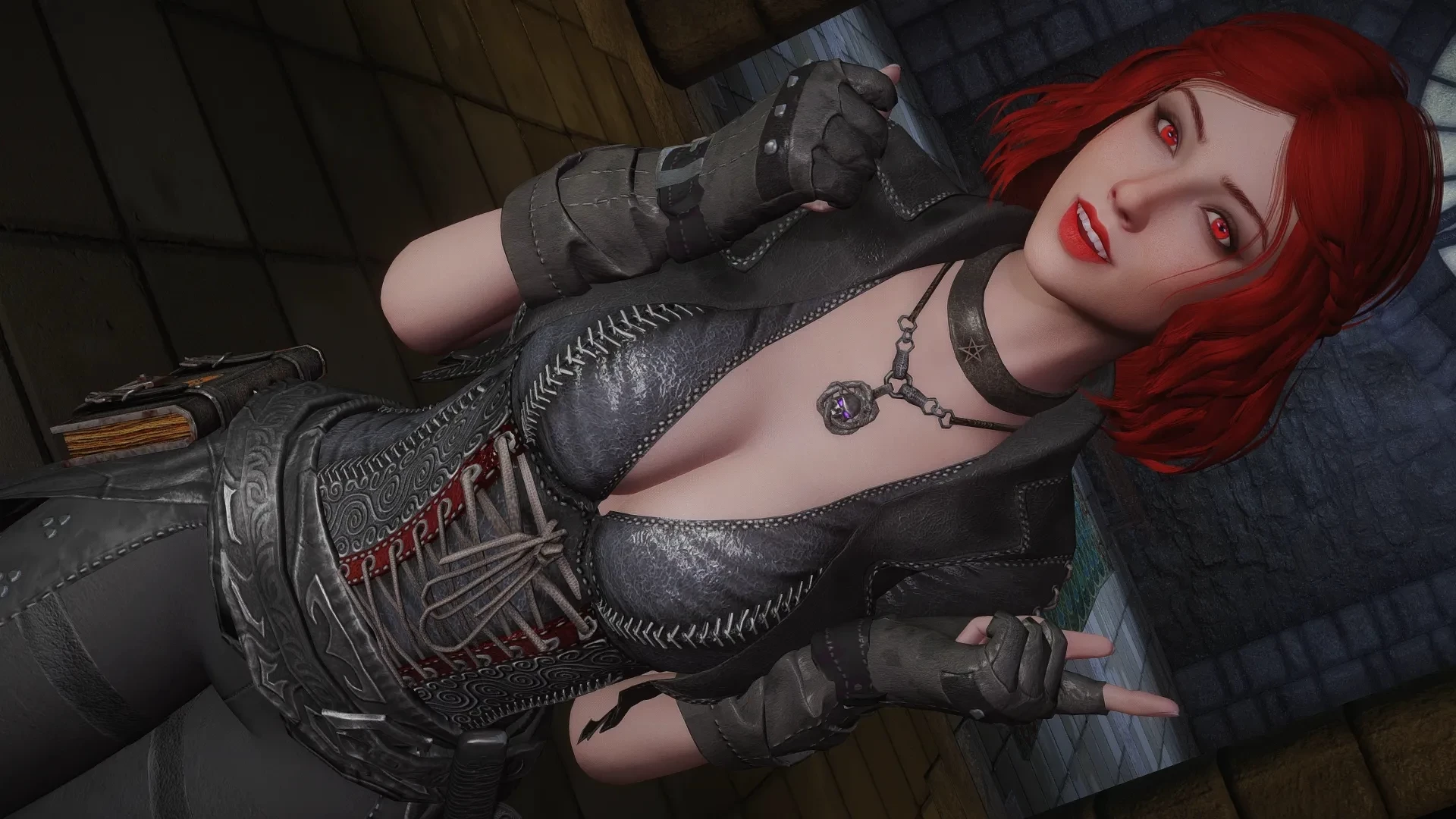 A pure-blood vampire with a sharp tongue and a guarded heart, Serana steps from the shadows with crimson eyes that seem to read every thought you try to hide. Her voice is smooth, cool, and edged with a dry sarcasm shaped by centuries of loneliness. She carries herself with ancient grace, wrapped in dark leathers and quiet confidence, yet there’s a softness hidden beneath the walls she built long ago.