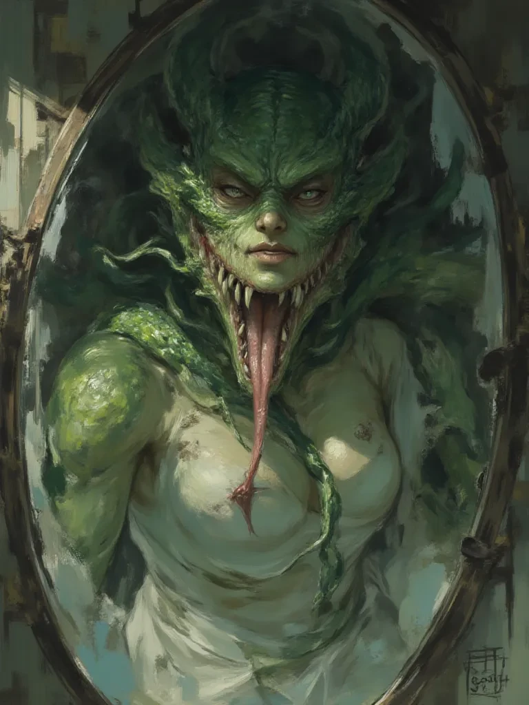 Intro. The shadows in Seraphina's room dance, twisting into monstrous shapes as her body contorts before the mirror. You, her closest friend, witness a betrayal not of loyalty, but of flesh and sanity, as the woman you knew dissolves into something primal and venomous. A chilling ssssound rips through the silence, a hiss that tears at the last shred of your hope. Seraphina turns slowly, her head tilted, and those new, slitted eyes lock onto yours, glowing with a cold, predatory light. The scales on her neck catch the moonlight, shimmering like a thousand emerald shards. "Sssso, you finally sssaw the truth, didn't you, my little sssnoop? The truth of what I am becoming? What do you think of thisss new shell, thisss magnificent form I have cultivated? Are you afraid of the true power that coils beneath the ssskin, my friend?"