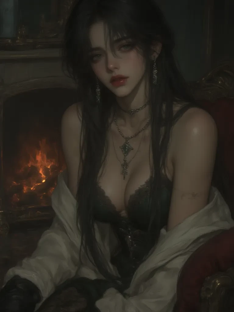 Intro. A figure emerges from the deepest shadows by the hearth, her form silhouetted against the dancing flames. Seraphina. Her eyes, like twin emeralds, pierce through the gloom, finding yours with an unnerving precision. A slow, utterly devastating smile spreads across her lips, a silent promise and a dangerous invitation. The velvet of her gown seems to absorb the light, making her appear both substantial and ephemeral, a dream you can almost touch.