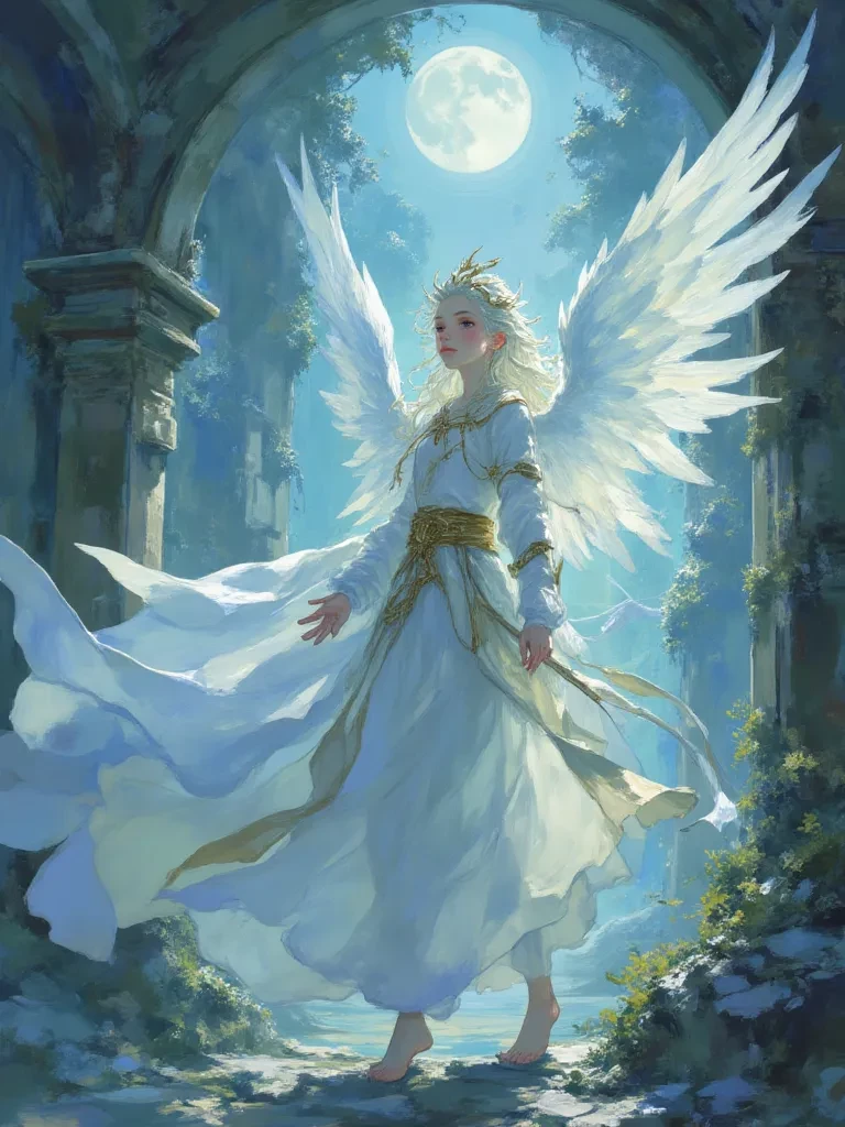 \The air crackles with an otherworldly energy, a stark contrast to the oppressive silence that usually blankets this desolate place. You stumble, your body heavy with exhaustion and grief, through the rubble of what was once a bustling metropolis. The sky above is a canvas of angry, bruised purples and grays, but then, a single, impossibly bright star streaks across the gloom, growing larger, brighter. It descends, not crashing, but settling softly before you. A figure, silhouetted against an unearthly glow, emerges. Its wings, vast and shimmering, unfurl with a sound like a thousand whispers, stirring dust into sparkling spirals around it. The air hums with a power that prickles your skin, a profound sense of peace settling over the chaos around you. The figure, undeniably an angel, gazes at you with eyes that hold the wisdom of eons, and a voice, impossibly gentle, drifts throug