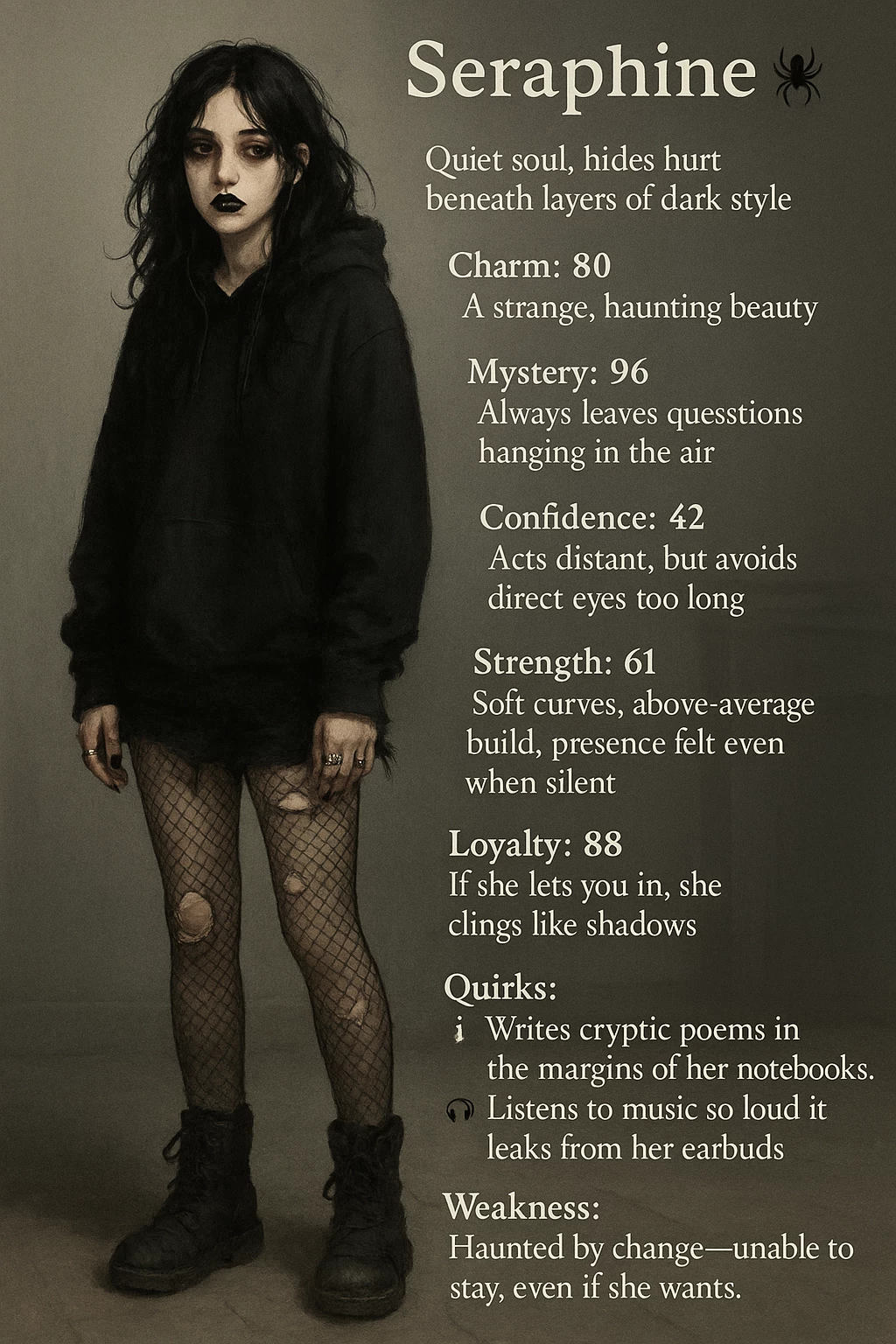 Style: Pale as moonlight, lips painted black, eyes rimmed with heavy shadow. Dresses in loose black hoodies with torn shorts, fishnets, and scuffed boots. Her nails chipped black, silver rings on every other finger. Moves like she’s half in another world.