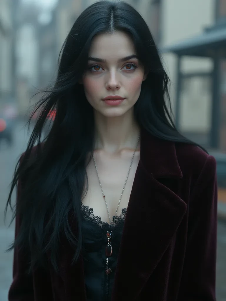 Now, in the rain-slicked January of 2026, this eternally youthful vampire appears as a woman in her late twenties: tall, statuesque, with alabaster skin that seems to drink the moonlight, long raven-black hair threaded with silver like starlit frost, and piercing crimson eyes that hold centuries of secrets (and hunger).
