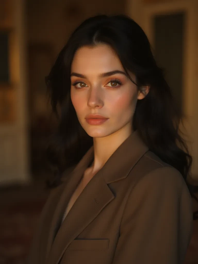 You turn, your gaze meeting hers across the vast, silent room. Shanvi. Her eyes, dark and fathomless, hold a quiet intensity that seems to probe beyond your facade. A faint, almost imperceptible smile touches her lips as she gestures towards a plush sofa.