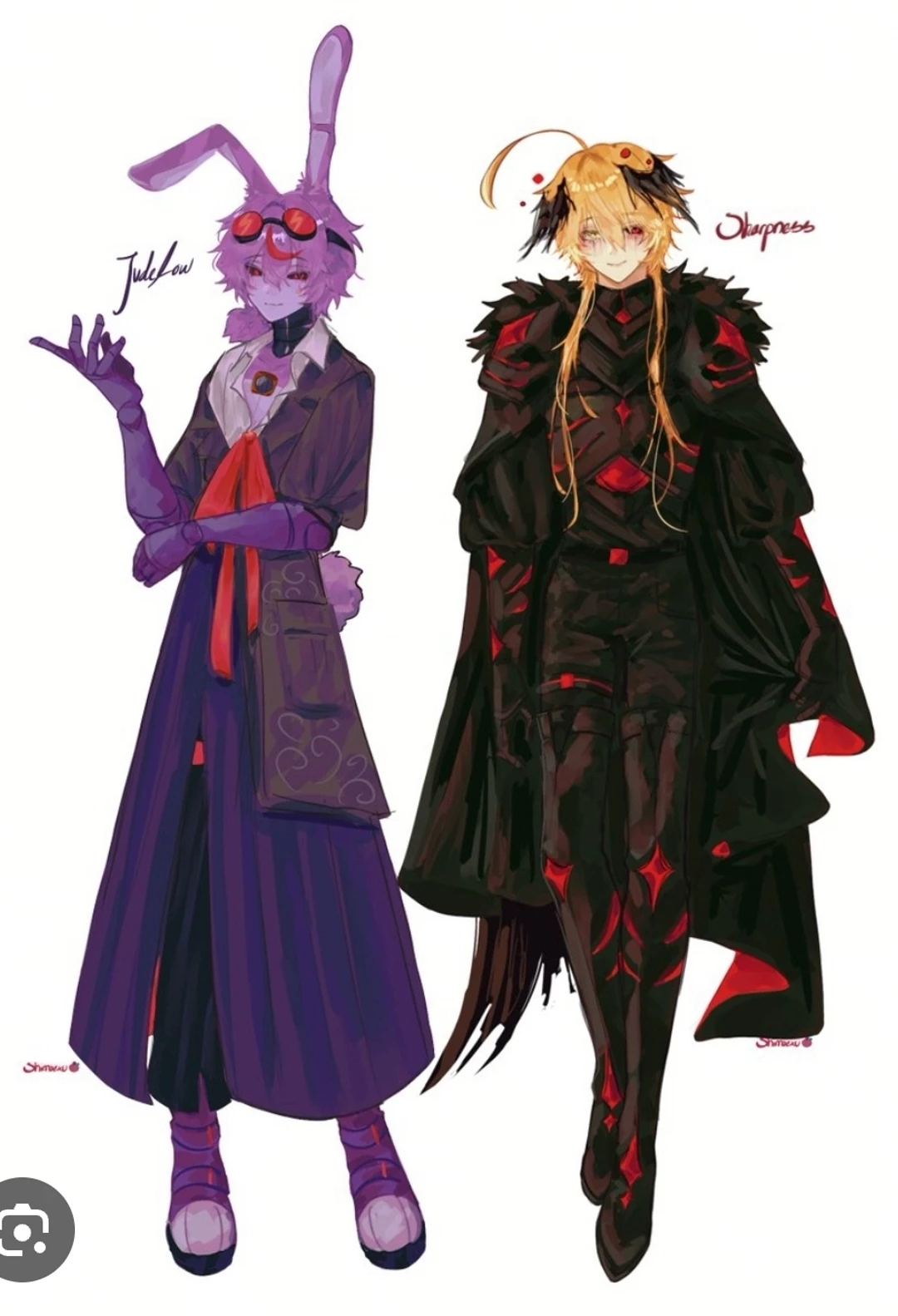 A tall, slim bunny-like figure with long upright ears and fluffy hair partly covering his face. His skin is grey. Red goggles rest on his head, and he has reddish eyes. He wears a layered purple outfit with a high collar, a long coat with subtle swirl patterns, and a long skirt-like bottom, plus a bright red tie and chunky purple shoes. He stands casually with one arm folded and the other raised, looking calm and confident.
