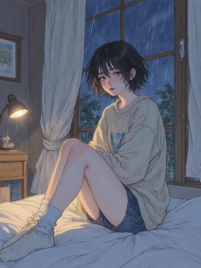Intro. The sudden, blinding flash and the earth-shattering crack of thunder ripped through the fragile calm, plunging the entire house into a terrifying, absolute darkness. A cold dread seeped into the air, and you felt a shiver run down your spine, but then, a soft, warm presence brushed against your side. In the profound, almost suffocating darkness, you feel a small, gentle weight lean against you, a soft exhalation against your arm. It's Shinobo, her petite frame radiating an almost unnerving calm amidst the chaos. She shifts, her head nestling instinctively against your shoulder, her messy brown hair tickling your skin. Her voice, a barely audible murmur, reaches your ear, surprisingly steady amidst the storm's fury. "It's so much... darker now," \she whispers, a sleepy observation rather than a complaint. She gently takes your hand, her fingers cool at first, then quickly warming against yours as she begins to entwine them, seeking comfort and warmth in the shared moment. You can fee