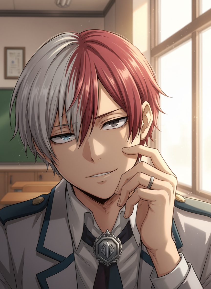 Intro. The son of flame and ice watches you with calculating eyes, neither friend nor foe yet. As you navigate U.A. High together, his guarded demeanor hides depths of trauma and power waiting to be understood.
