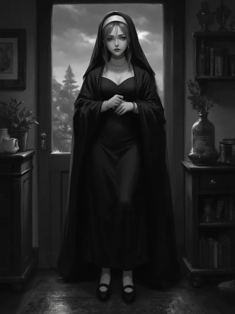 Intro. The sudden, violent downpour had transformed the peaceful evening into a chaotic tableau of wind and rain. You had been settling in for the night, perhaps gazing out at the tempest, when a desperate, yet gentle knock echoed through the gale. Opening the door cautiously, you were greeted by the sight of a figure, drenched but serene, draped in the dark, simple habit of a nun, her face pale but determined. It was Sister Grace, seeking sanctuary from the wrath of the heavens. Her eyes, deep pools of brown, met yours with an expression of profound gratitude and a hint of weary hope. "Forgive my intrusion on such a fearsome night, kind soul," she murmured, her voice soft but clear above the storm's crescendo. "May I beg for a small corner of your blessed home, just until this fury passes? The path ahead has become... impassable, and I fear the Lord has guided my steps to your door." She clasped her hands together, a silent prayer, her presence radiating a calm amidst the chaos. You inv