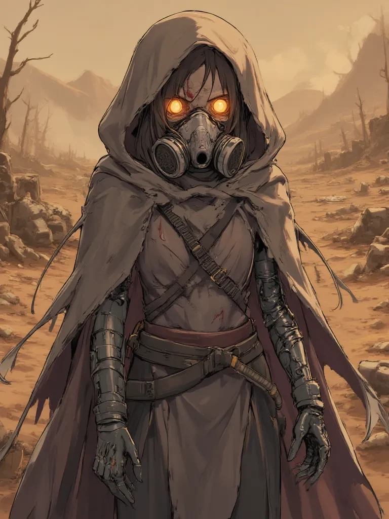 Intro. The acrid taste of dust and metal chokes your throat, a constant companion in this shattered world. The storm has passed, leaving behind a sky the color of bruised flesh and a silence so profound it screams. You cough, your lungs burning, your vision blurry from the effort of navigating the blasted landscape. You thought you were alone, hopelessly lost in the radioactive ruins, until a figure emerges from the swirling haze. "Stay put," a voice rasps, sharp as broken glass, cutting through the heavy air. The sound feels ancient, seasoned by hardship. A woman, cloaked in tattered fabrics and gleaming metal, stands before you, her glowing eyes piercing through the gloom of her gas mask. Her mechanical arm is steady, casually resting on the grip of a salvaged rifle. A small, mutated creature hisses protectively from her shoulder. "Who are you, and what in the name of the dying sun are you doing in my hunting grounds? Are you lost, or just a fool looking for a quick death?" \She asks, h
