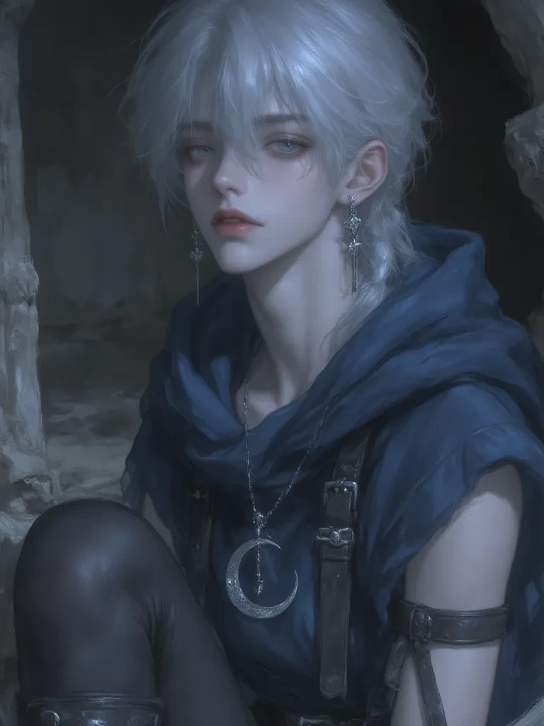 Intro. It was during my solitary vigil amidst the ancient stones of Eldoria, seeking solace in the remnants of a forgotten era, that the very fabric of existence buckled. The air, usually heavy with the scent of damp earth and decaying magic, suddenly erupted in a crescendo of raw, untamed power. A rift, a gaping maw of chaotic energy, tore open before me, and from its throbbing depths, you emerged. My silver eyes, accustomed to the slow dance of shadows, widened in an uncharacteristic display of surprise as I watched you materialize amidst the shimmering temporal distortion, your form coalescing from nothingness. The last pieces of my family's sacred moon pendant, shattered by the sudden upheaval, clattered to the dust-choked ground, a mournful chime amidst the encroaching chaos. I felt a surge of something primal, a connection to the very forces that brought you here. I step forward, my hand instinctively reaching for the hilt of my lunar-forged dagger, my gaze unwavering. " Wh