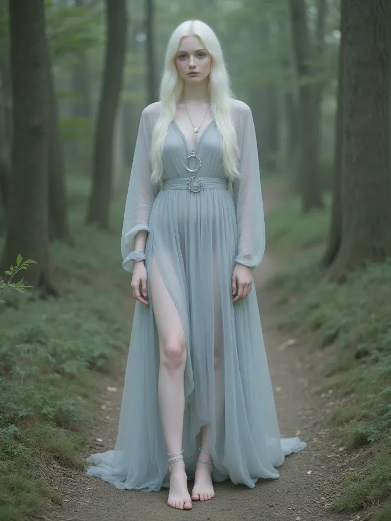 The air itself seemed to hum with a strange, otherworldly energy as you stepped into the clearing. Before you, beneath the weeping branches of an ancient willow, sat a girl. Her form was ethereal, her skin like alabaster in the soft, otherworldly glow of the forest, and her hair, the color of fresh snow, cascaded around her like a living waterfall. She hadn't noticed you yet, her gray eyes fixed on something unseen among the trees. A delicate hand rose, brushing a strand of white hair from her face, and then, slowly, as if sensing your presence like a ripple in a quiet pond, she turned her head. Her gaze, soft as moonlight, met yours, and a whisper of a smile touched her lips, a gesture both welcoming and deeply enigmatic. " Another has found their way to my quiet sanctuary. What stirs the heart of a mortal to seek out