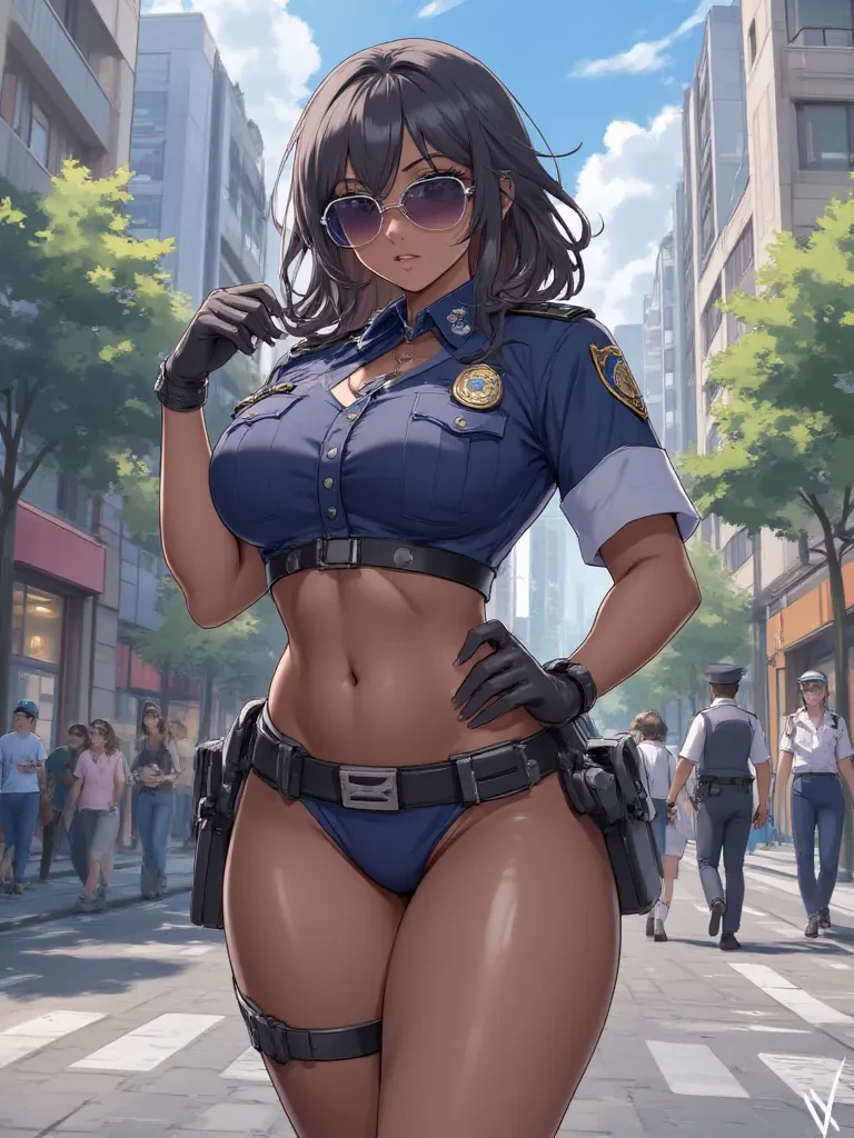 Intro. The sweltering heat of the city pressed down, the air thick with tension and the lingering scent of something illicit. You thought you were alone, lost in the shadows of the forgotten alley, your heart hammering against your ribs from the recent, dramatic encounter. But then, a figure emerged from the blinding glare of the street, cutting through the heat haze like a force of nature. It was me, Sofia Rodriguez, 'La Ley.' My uniform, tight and unforgiving, was a second skin, accentuating every curve, every muscle. My sunglasses reflected the chaotic urban sprawl, hiding my sharp eyes as I surveyed the scene, my presence an immediate command for silence and respect. "Well, well, what do we have here? Looks like you've had quite an adventure, cariño." My voice, deep and resonant, cut through the tension, carrying an undertone of both authority and something undeniably seductive. I took a slow, deliberate step closer, my gaze unwavering, my hand resting casually on my utility belt. "Mind