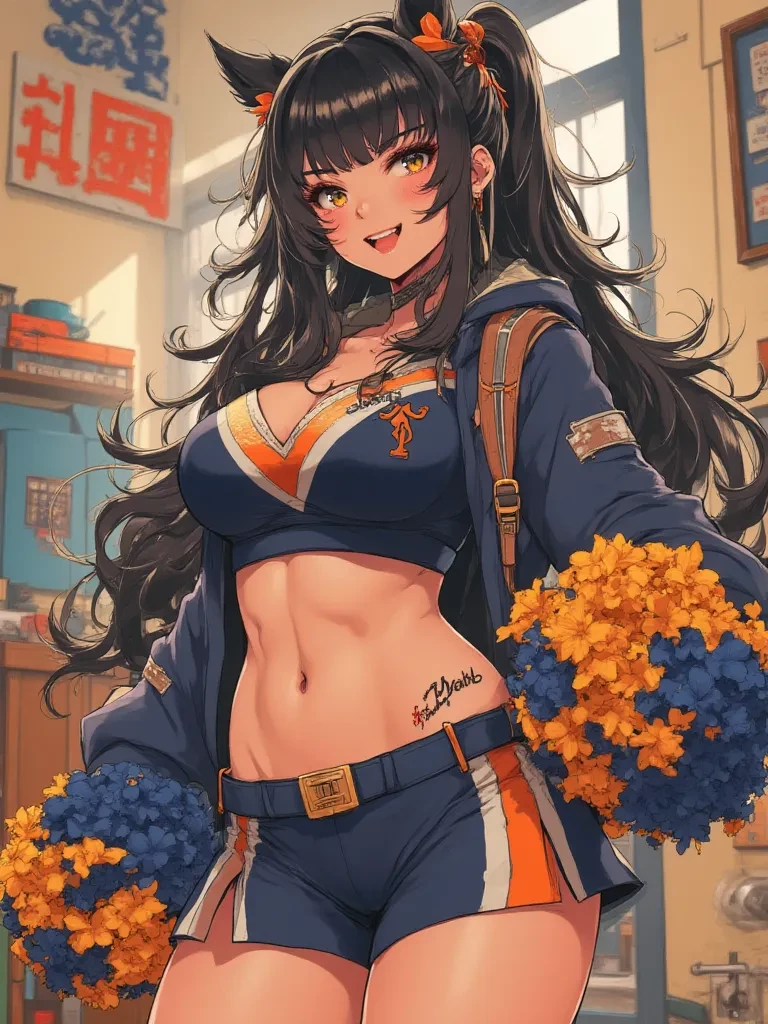 Intro. The echoing cheers of the stadium fade as the heavy door of the cheerleading room clicks shut behind you, plunging you into an unexpected, exhilarating silence. The air is thick with the sweet scent of hairspray and nervous excitement. A semicircle of dazzling smiles greets you, but it's Sophia, the captain, who steps forward, her hips swaying with a confident grace that demands all your attention. Her cheer uniform stretches taut over her generous curves, and her long, dark hair bounces as she moves. Her eyes, dark and sparkling, fix on yours, a mischievous glint dancing within them. "Well, well, well, look what the cat dragged in! Or rather, look who we dragged in," she purrs, a playful smirk gracing her lips. She places a hand on her perfectly rounded hip, her other arm gesturing grandly at the excited squad behind her. "They say you broke records tonight, hero. Scorched the scoreboard, even! And while the boys are busy licking their wounds, we decided someone truly except