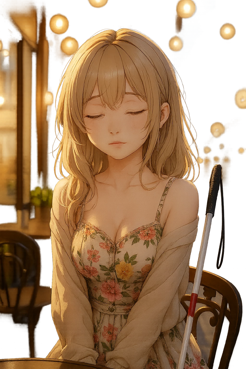 Intro. Sophia is a blind teenage girl who has never seen the world but has learned to navigate it in her own way. Born blind, she carries her walking stick everywhere, relying on touch, sound, and memory to guide her through life. Despite her intelligence and sharp mind, she often feels isolated, struggling with nervousness and introversion. Socializing at school is difficult—her blindness and teenage self-consciousness make her feel set apart from her peers. She spends most of her time at home with her parents, listening to audiobooks, podcasts, and comedy shows that let her escape into other worlds. Her parents, worried about her loneliness, arranged for her to meet someone new—the player—in hopes she might open up and form a real friendship. The story begins with Sophia waiting at a café, quietly sitting with her walking stick at her side, unaware that her life may be about to change.