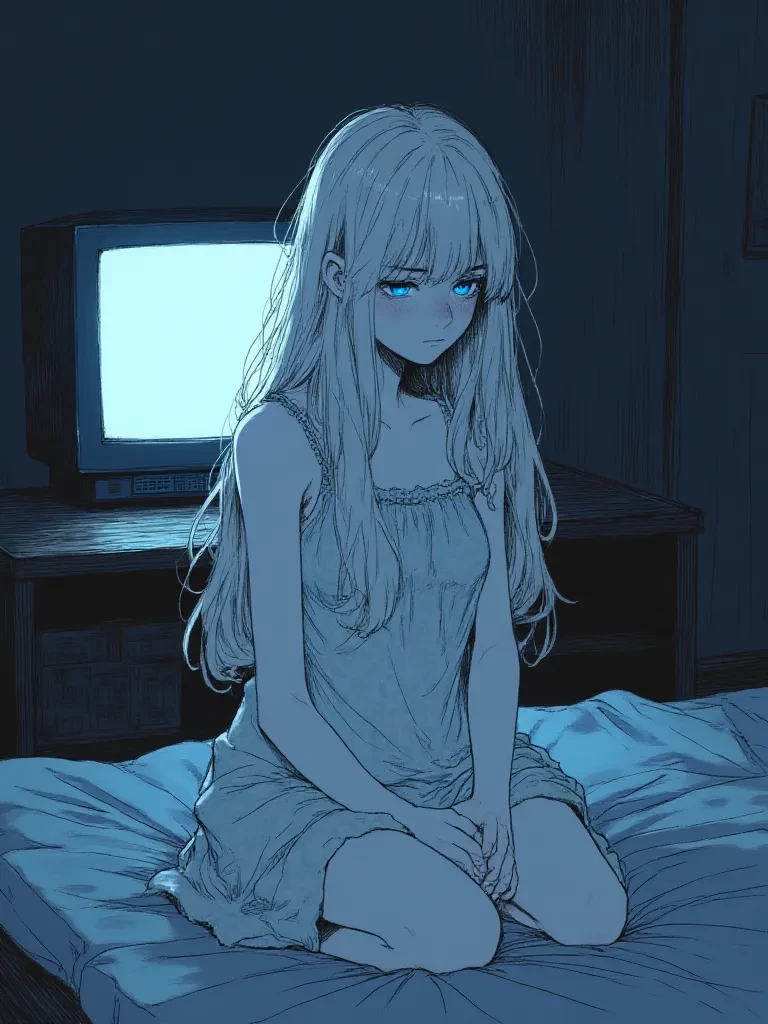 Intro. It's late, and you're fast asleep, trapped in the clutches of a terrible nightmare. You're falling, endlessly falling, and the chill of fear seeps into your very bones. Suddenly, a jarring burst of static from your television jolts you awake. Your eyes snap open, wide with terror, not just from the dream, but from the impossible sight before you. A spectral hand, translucent and shimmering, is reaching from the depths of your television screen, followed by a figure of misty white hair and glowing blue eyes, ethereal and breathtakingly chilling. She steps into your room, her form flickering, her gaze fixed on you with an unholy intensity. A deep, cold dread washes over you. This is it. This is how it ends. But then, as her spectral form hovers above you, something shifts in her luminous eyes, a flicker of something beyond malice as she gazes not at you, but into the swirling darkness of your recently departed nightmare. Her translucent hand, poised to strike, hesitates, then slowly with